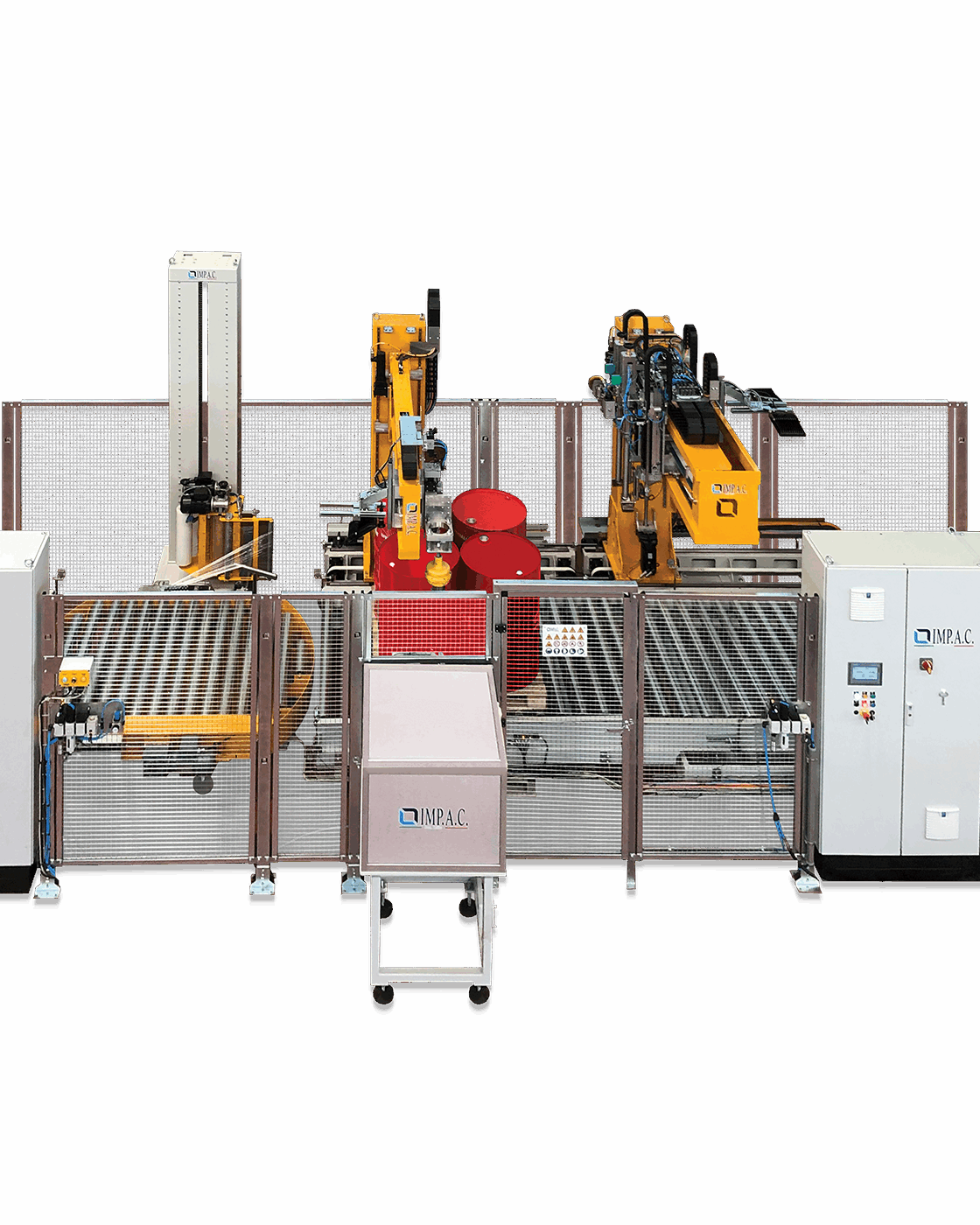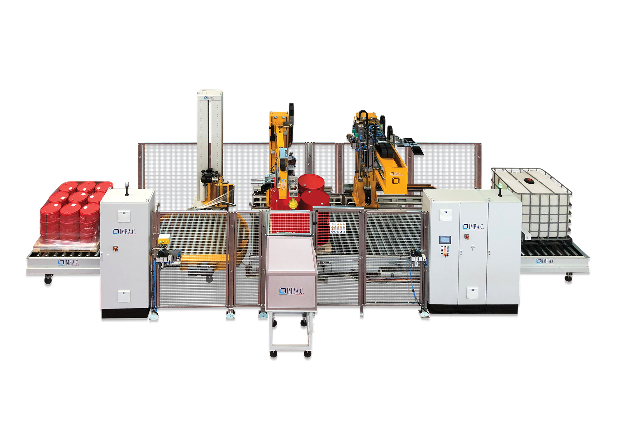 L’IMP.A.C. 56 A VISION è un sistema di infustamento automatico progettato per il riempimento di prodotti chimici e affini in fusti da 60 e 220 litri su paletta o in cisternette IBC da 1000 litri.